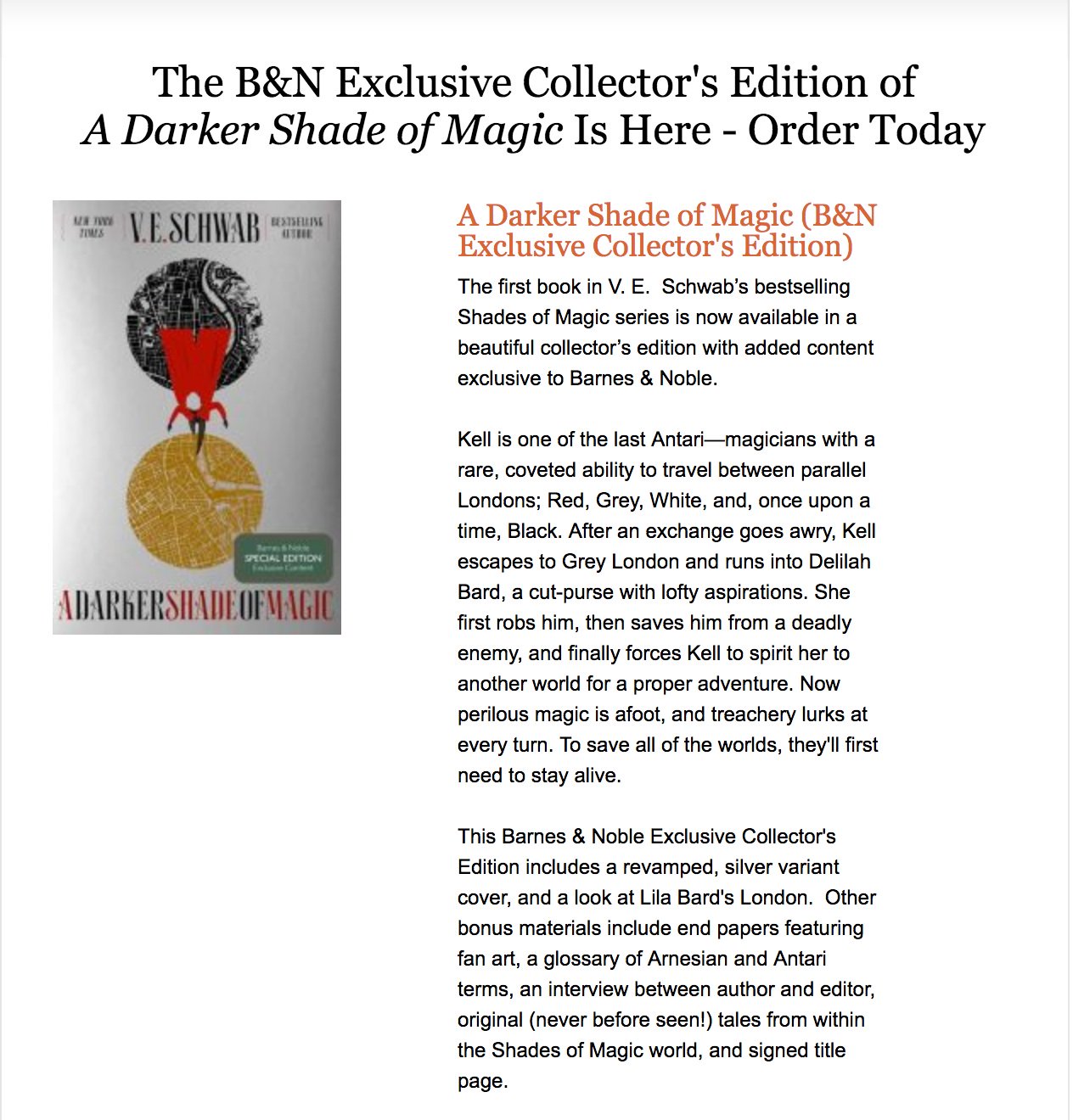 For shipping outside the us please add an additional 20 donation to con or bust. One hardcover barnes and noble collectors edition of a darker shade of magic by v e. With a revamped metallic ink detailed cover and reading ribbon this edition will also feature the following bonus material end papers featuring fan art a glossary of arnesian and antari terms an interview between a darker shade of magic the first book in v e. Collector s edition collector s by v e.