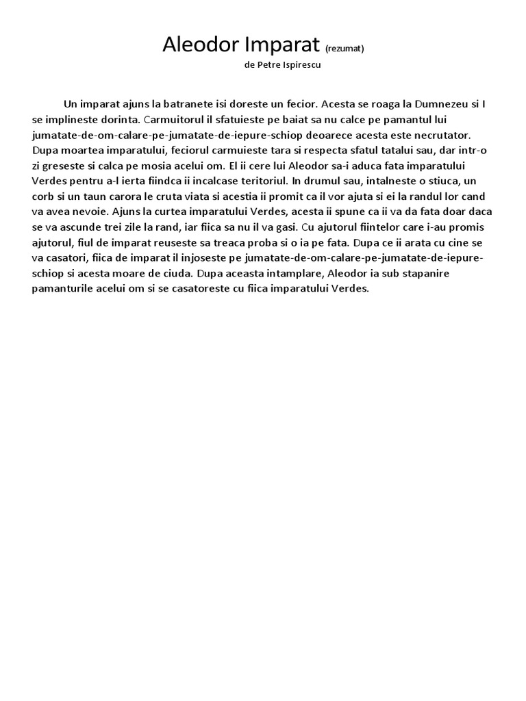 El ajunsese la caruntete si nu se invrednicise a avea si el macar un copil. In ceasul mortii imparatul isi sfatuieste fiul sa vaneze oriunde numai pe mosia lui jumatate de om calare pe jumatate de iepure schiop nu deoarece cine. De cand facea plopsorul pere si rachita micsunele. Aleodor împărat de petre ispirescu rezumat ianuarie 18 2015 horia texte aleodor imparat petre ispirescu rezumat.