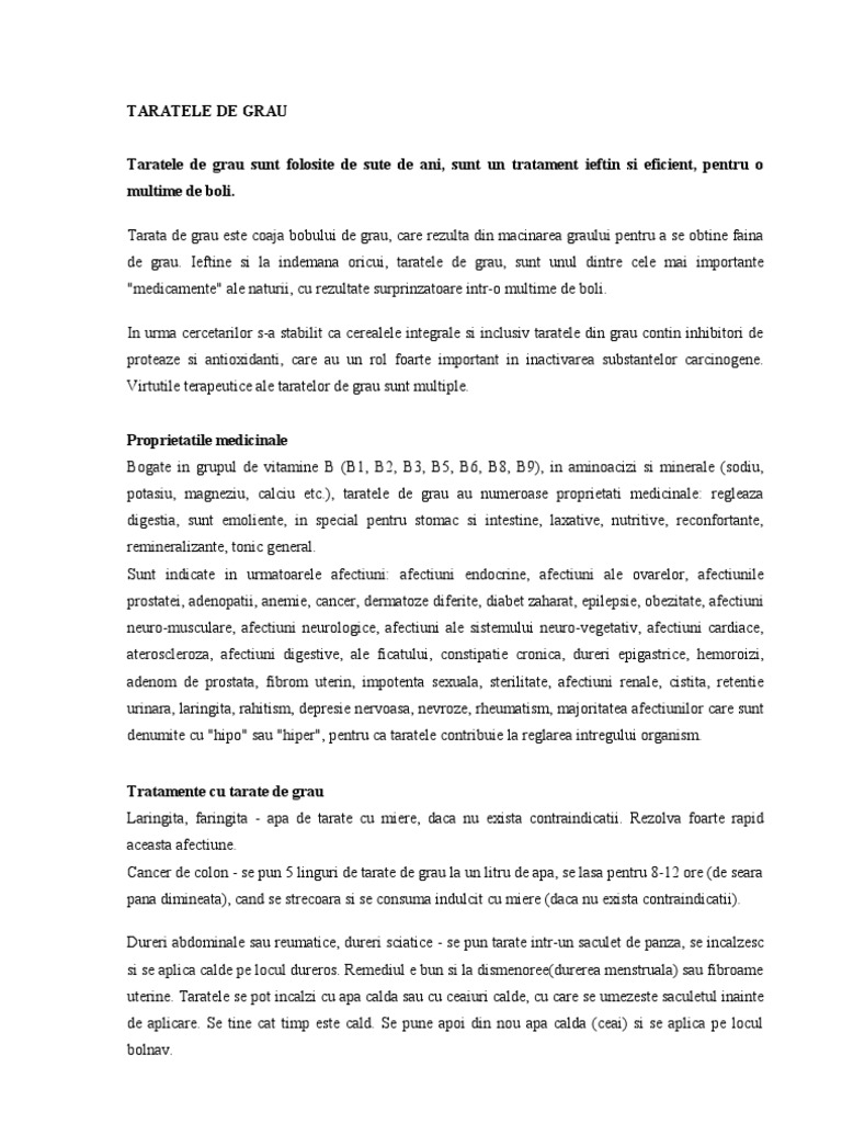 Se adauga 200 g tarate de grau la un litru apa clocotita si se lasa sa stea timp de 7 ore. Cistita in aceasta afectiune se combina taratele de grau su plante medicinale. Impotenta la apa de tarate preparata ca mai sus se adauga suc de telina 50 ml la litru. Acest lichid se foloseşte zilnic şi la clisme.