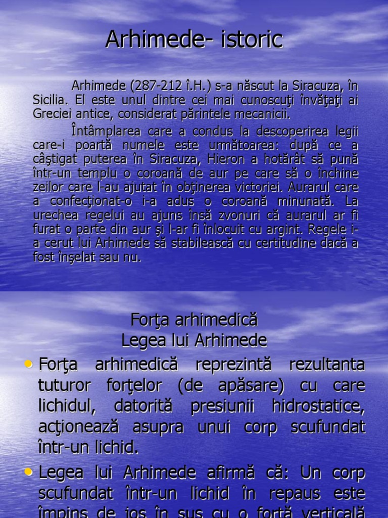 Razele de căldură ale lui arhimede. Biologie chimie fizică geografie matematică limba şi literatura română muzică şi mişcare știinţe ale naturii om şi societate. Fiu al unei familii nobiliare grecesti arhimede s a nascut în anul 287 î hr în orasul siracuza insula sicilia. Legea lui arhimede legea lui arhimede sau principiul lui arhimede este o lege a staticii fluidelor care afirmă că un corp scufundat într un fluid este împins de către fluid de jos în sus cu o forță egală cu greutatea volumului de fluid dislocat de.