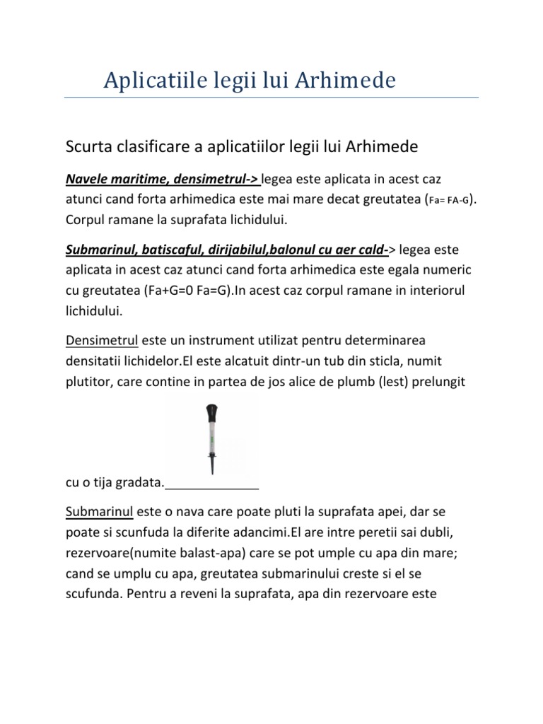 A fost descoperită în mod empiric de către arhimede în secolul al iii. Gimnazial fizica lecţii aplicatiile legii lui arhimede. El indica densitatea lichidelor. Aplicatii ale legii lui arhimede.