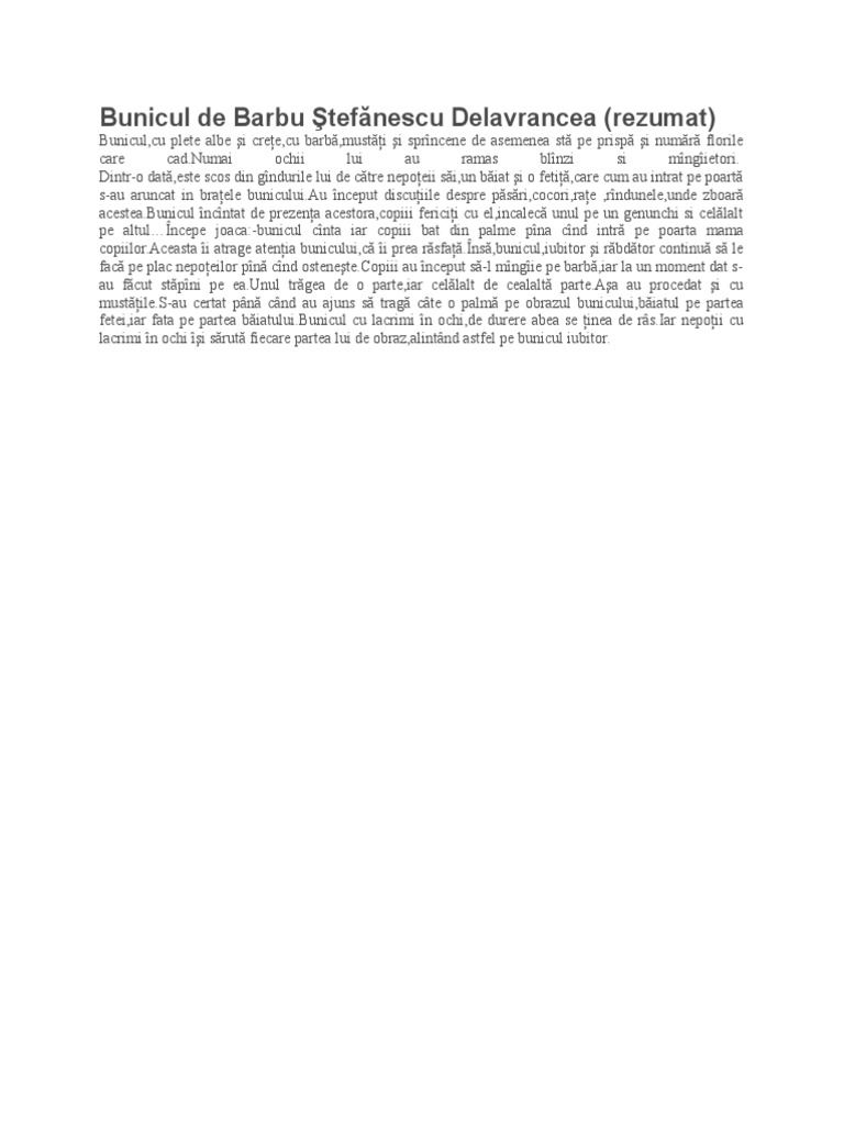 Bunicul de barbu stefanescu delavrancea rezumat. Pletele lui albe qi crele parc5 sunt niqte ciorchini de flori albe. 0 comments bunicul cu plete albe şi creţe cu barbă mustăţi şi sprîncene de asemenea stă pe prispă şi numără florile care cad numai ochii lui au ramas blînzi si mîngîietori. Innumirl florile care cad se uitl n fundul gridinii. Bunicul sti pe prisp se gandegte.