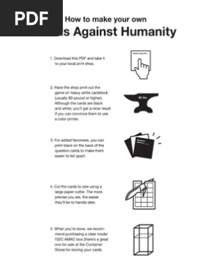 Here are some files you can print out and use for your own copy of cards against humanity. We add various expansion packs to christmas stockings birthday presents and anniversary presents and max has wanted to join us for a long time too. Cut the cards up using one of those big slicers. The cards are all black and white but if you can convince them to use the color printer for no additional cost you ll get a much nicer result.
