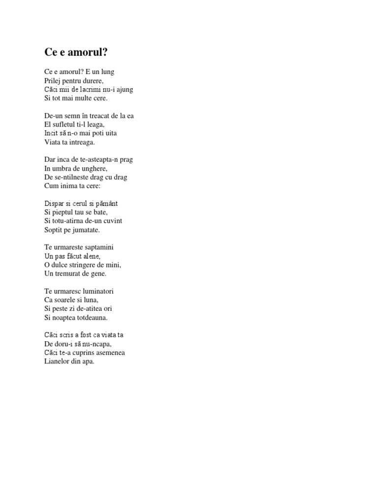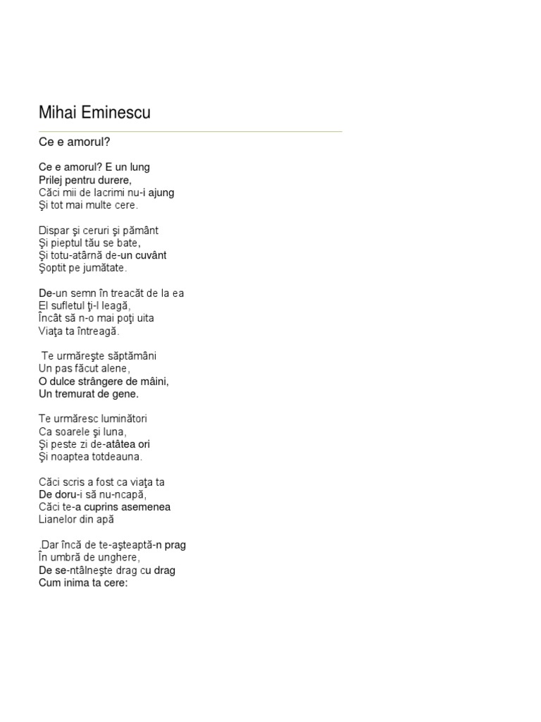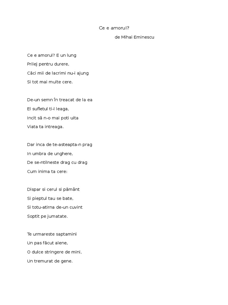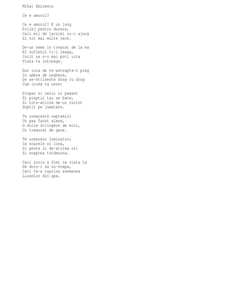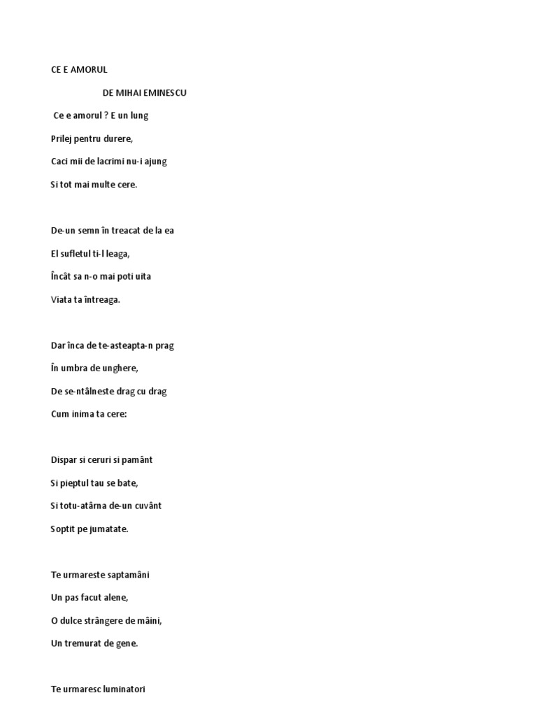 Ce e amorul de mihai eminescu. De un semn în treacăt de la ea el sufletul ţi l leagă încât să n o mai poţi uita viaţa ta întreagă. Dar inca de te asteapta n prag in umbra de unghere de se ntilneste drag cu drag cum inima ta cere. Versuri ce e amorul de mihai eminescu. De un semn în treacăt de la ea el sufletul ţi l leagă încât să n o mai poţi uita viaţa ta întreagă.