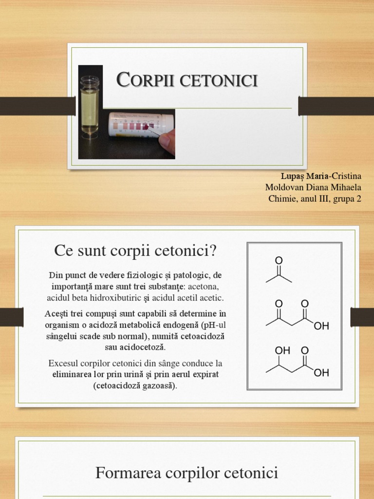 Ei bine exista trei corpi cetonici. Corpii cetonici sunt substante care apar prin arderea lipidelor. Acest proces ce are loc exclusiv la nivel hepatic în caz de inaniție exerciții fizice intense alcoolism sau în cazul diabetului zaharat de tip 1 netratat.