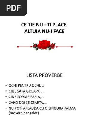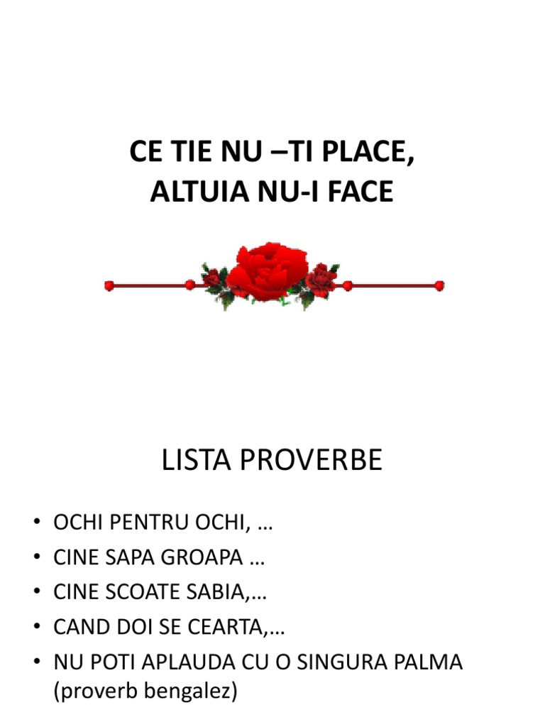 Intr adevar baza o reprezinta proverbul ce tie nu ti place altuia nu i face. Sau să te ocărască sau să te necinstească sau să se răzbune sau să ţi facă alt rău. Bătrânii au o vorbă. Ce ție nu ți place altuia nu i face.