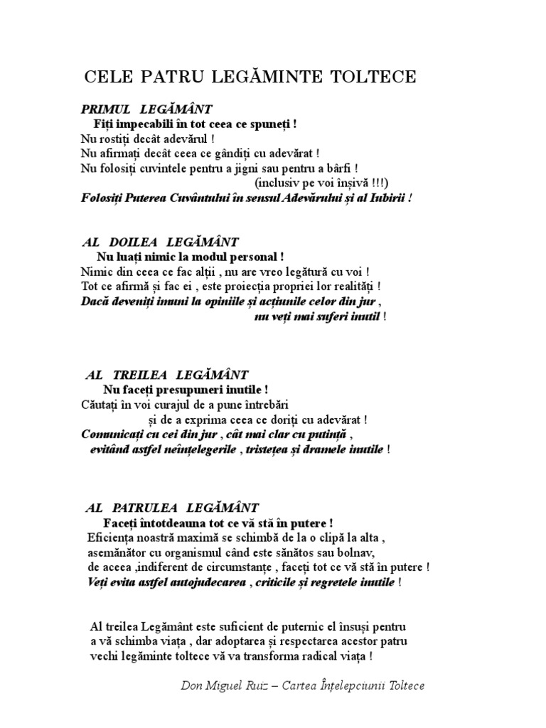 Cele patru legaminte don miguel ruiz pdf. Cele patru legaminte reprezinta de fapt instrumente ce te pregatesc sa iti gasesti calea catre tine insuti sa iti pastrezi integritatea iubirea de sine si pacea interioara. Fii impecabil in tot ceea ce spui 16 al doilea legamant. In lucrarea cele patru legaminte don miguel ruiz ne a indicat un cod de conduita simplu dar extrem de eficient prin care ne putem redobandi libertatea personala si fericirea pe care o meritam.