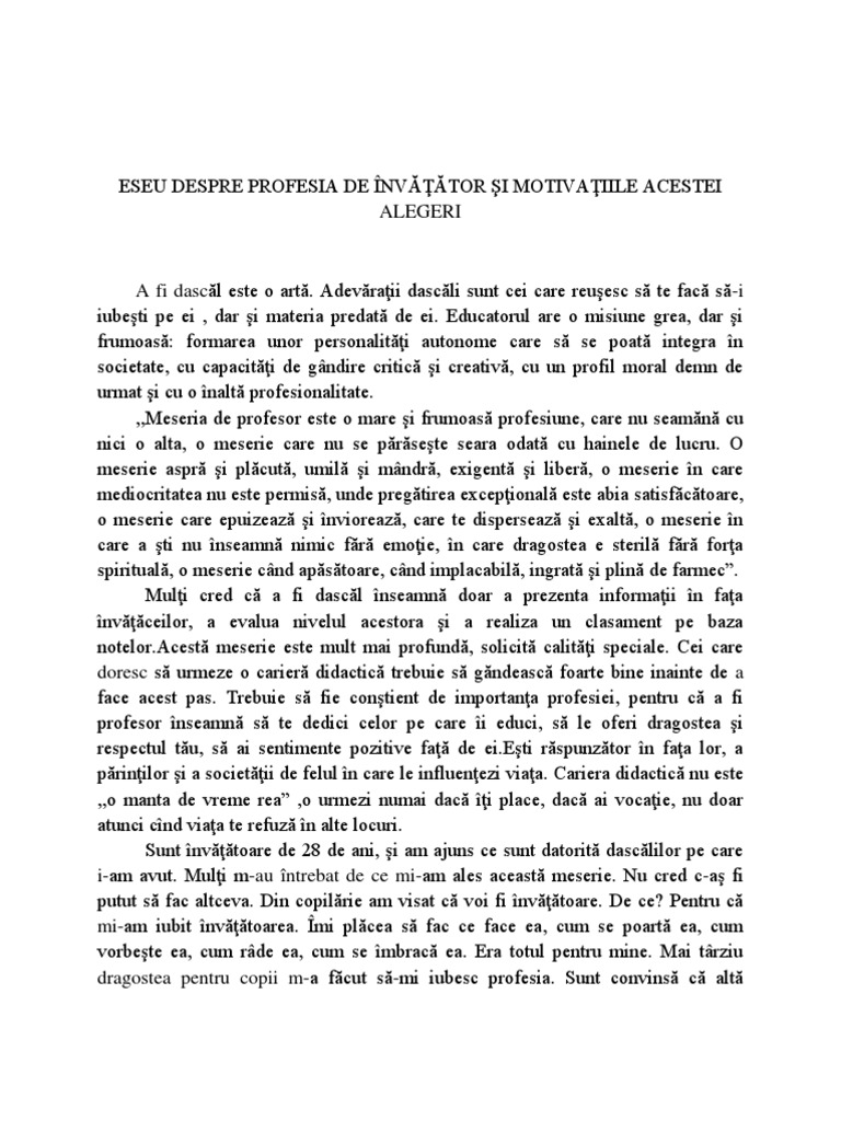 Eseu despre cariera didactica. N cadrul colii profesorul este conductorul activitii didactice care se desfoar n vederea atingerii. Scrisul de pe acest subiect este destinat să reamintească de cât de mulți profesori au făcut pentru noi. învăţământ gimnazial învăţământ special proiecte educaţionale clasa a 7 a.