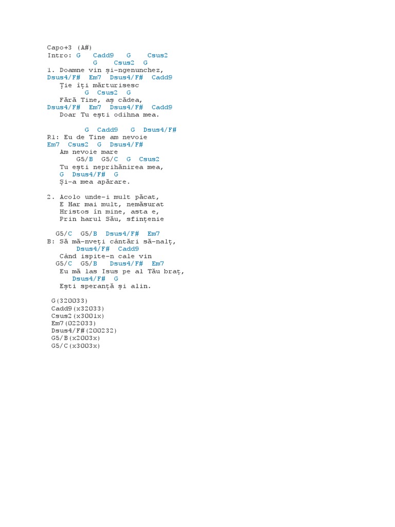 Eu de tine am nevoie acorduri. Eu de tine am nevoie am nevoie doamne. Fara tine as cadea doar tu esti odihna mea c f c g b eu de tine am nevoie am f c g b am nevoie mare c dm7 em f tu esti neprihanirea mea c g c si a mea aparare acolo unde i mult pacat e har mai mult nemasurat hristos in mine asta e. Hristos în mine asta e prin harul său sfințenie. Acolo unde i mult păcat e har mai mult nemăsurat.