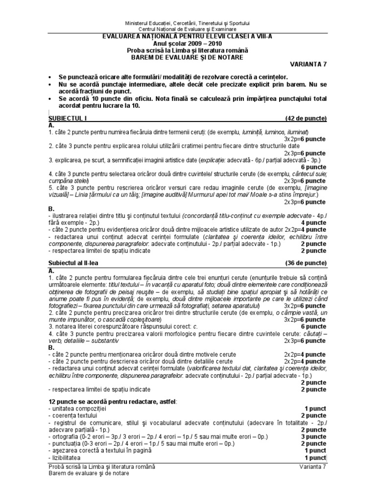 Vezi subiectele si baremele de corectare pentru testele de antrenament clasa a 8 a. Evaluarea națională la clasa a viii a va continua marți 21 iunie cu proba la limba și literatura maternă și miercuri 22 iunie cu proba de matematică. Subiecte evaluare nationala romana 2009 2015 abonati va la newsletter si veti fi la curent cu ultimele stiri. Subiectul i 42 de puncte citeste cu atentie textul urmator.