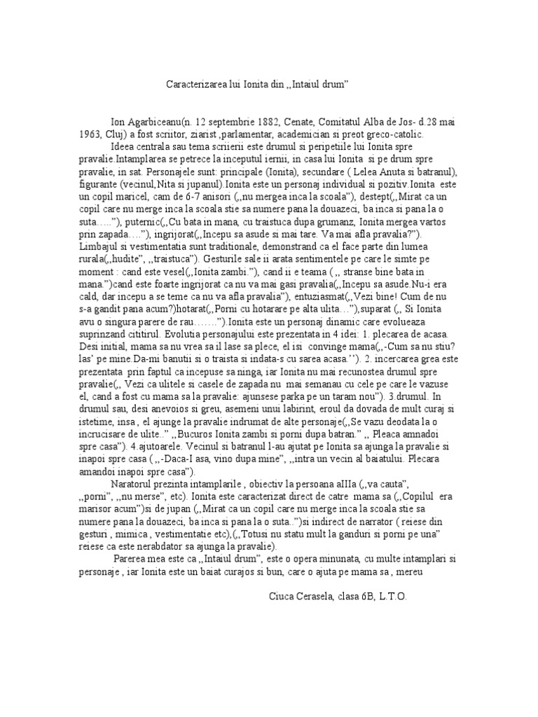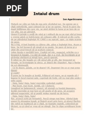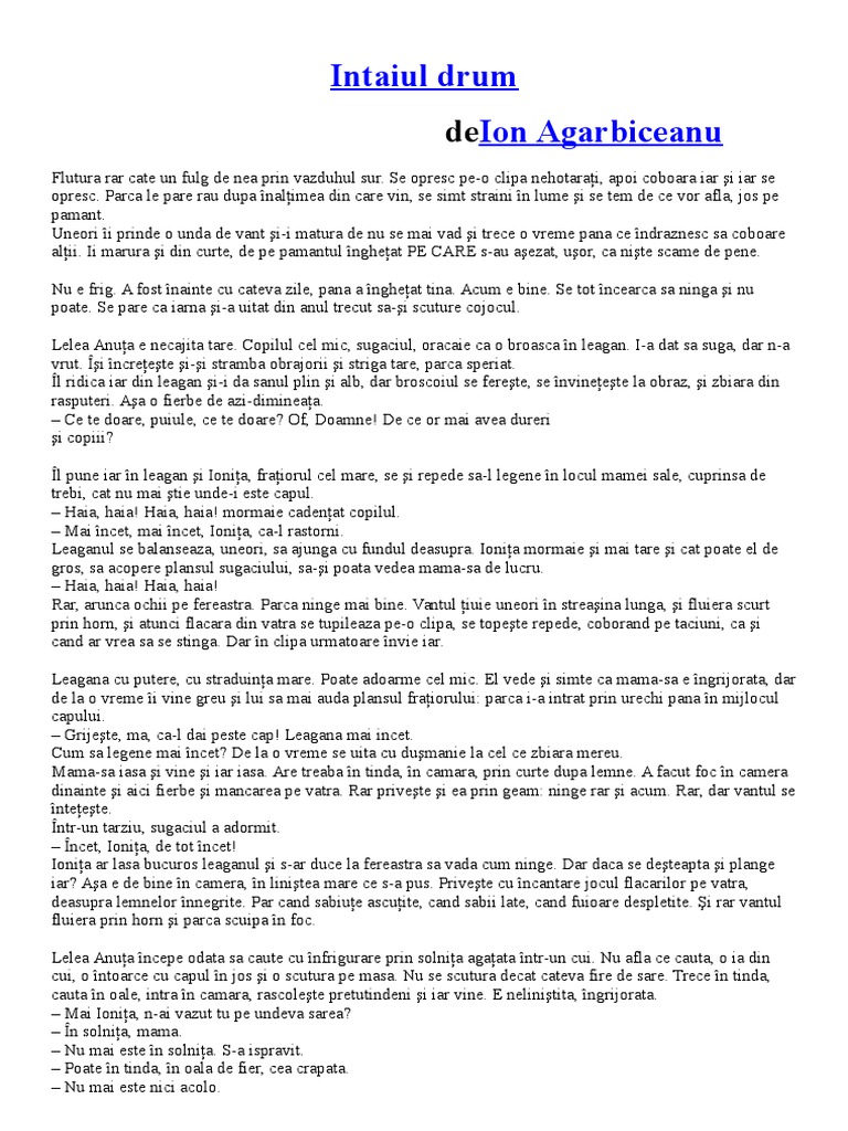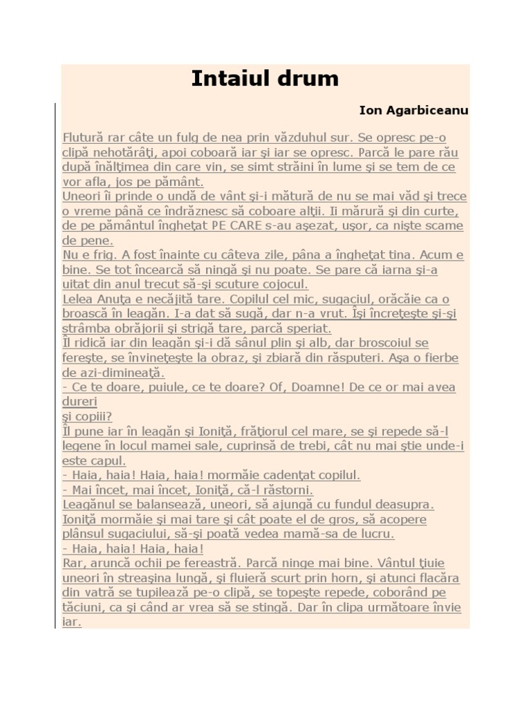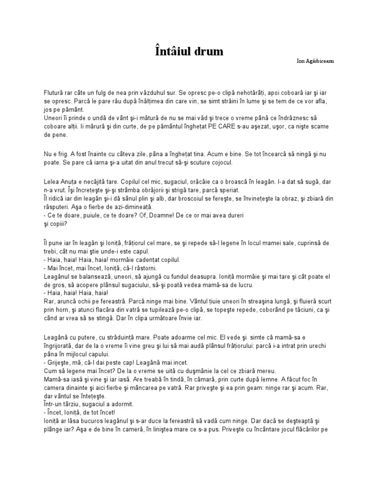 Flutură rar câte un fulg de nea prin văzduhul sur. Rezumat scurt pentru povestirea intaiul drum din manualul de clasa a 6 a in care este vorba despre un baiat de cinci ani care pleaca la pravalie iarna si se rataceste pe ulitele satului. 28 mai 1963 80 de ani cluj republica populară română. întâiul drum de ion agârbiceanu comentariu literar rezumat literar literatură.