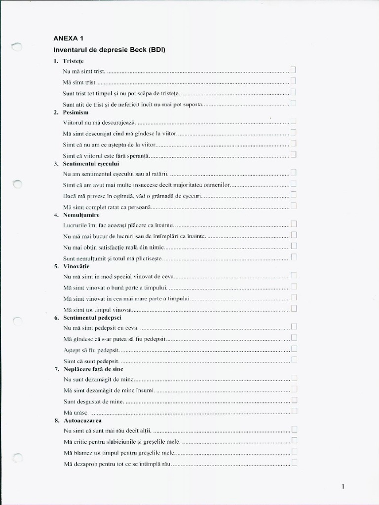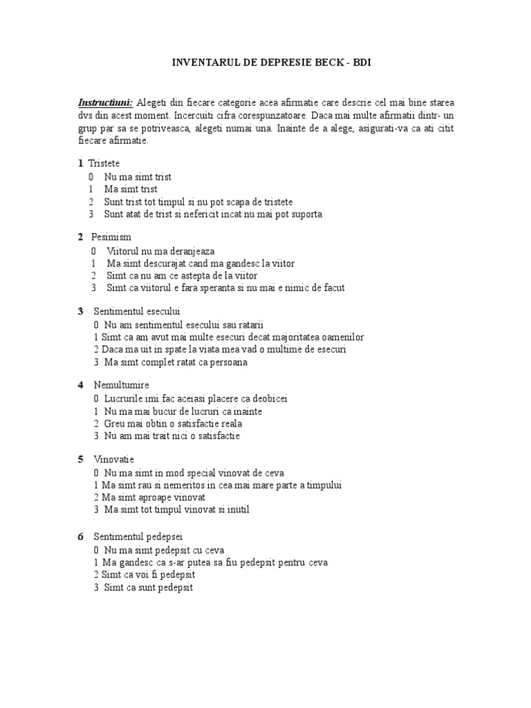 Inventarul de depresie beck fisa de analiza data examinarii nume si prenume. Bdi ii 1996 a fost creat de aaron beck în același timp cu modelul cognitiv al depresiei. Acest chestionar este format din 21 de grupuri de afirmatii. 21 itemi completati chestionarul incercuind numarul propozitiei alese.