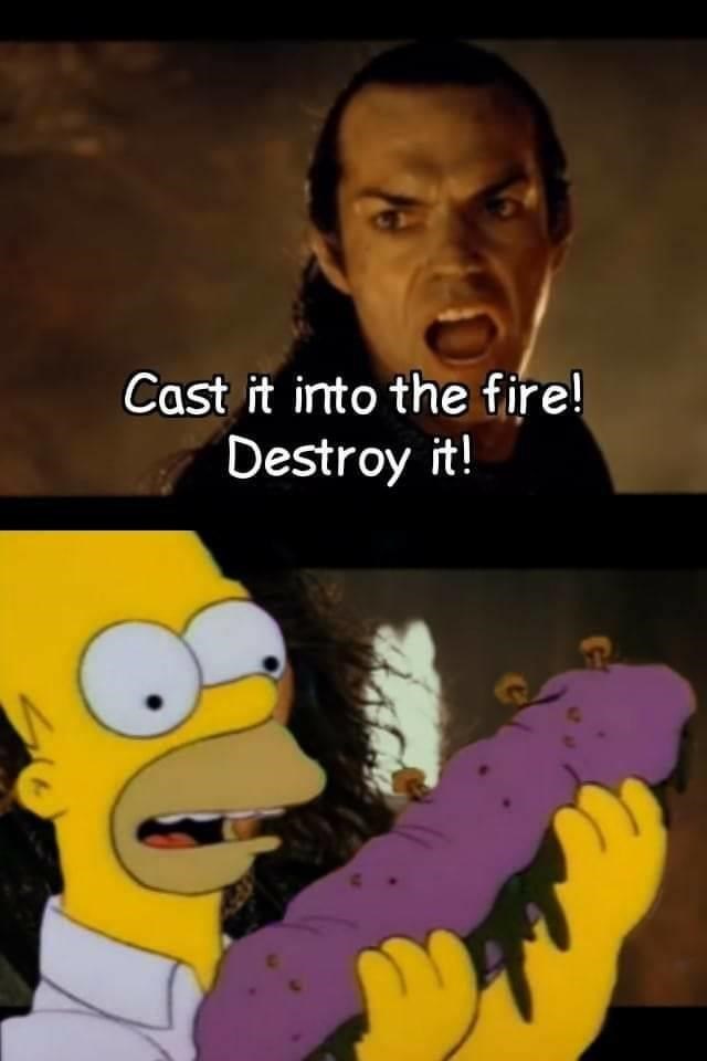Lord of the rings cast it into the fire meme. Online people have recontextualized the scene through object labeling to express opinions about things they know they should discard but willingly keep. Cast it into the fire is a memorable quote uttered by the character elrond in the 2001 fantasy film lord of the rings. This particular meme features the characters elrond hugo weaving and isildur harry sinclair standing above a fiery volcano. All you have to decide is what to do with the upvotes that are given to you.