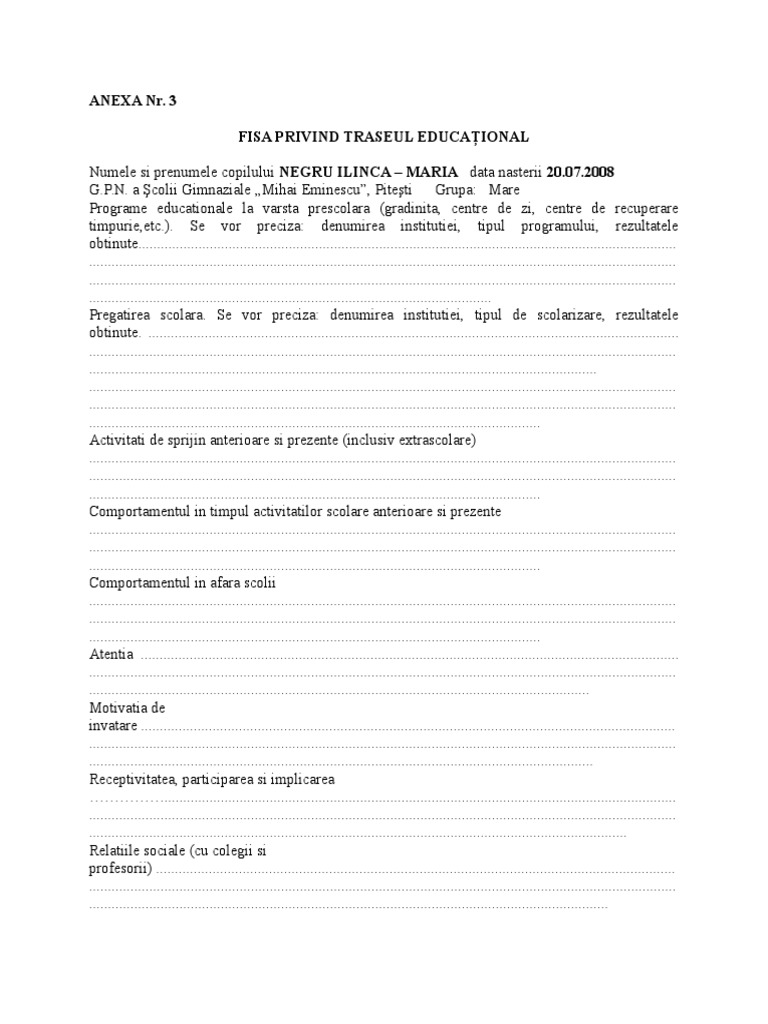 Model Completare Fisa Privind Traseul Educational