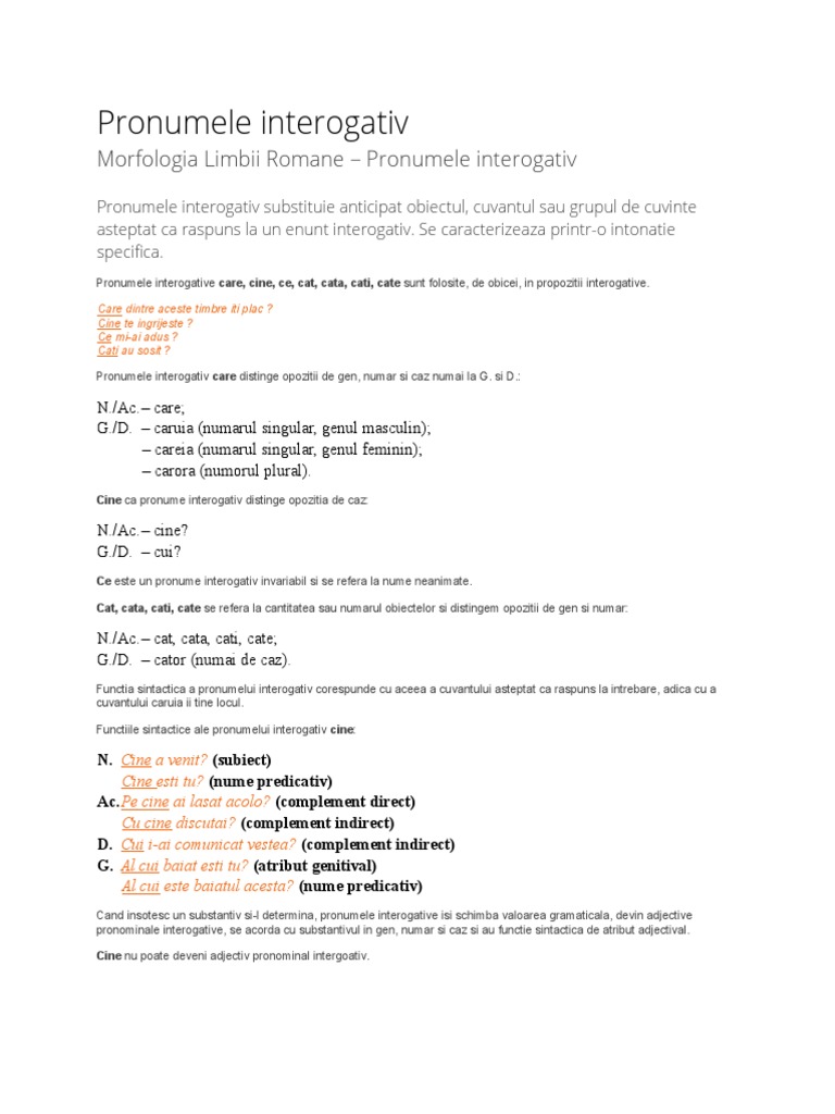 Si noi suntem copii. Manuale auxiliare si softuri educationale utile si acasa si la scoala. Precizează funcția sintactică și cazul pronumelui adjectivului pronominal interogativ. Pronumele interogativ este folosit în propoziții interogative și ține locul obiectelor ființe sau lucruri așteptate ca răspuns la întrebările puse.