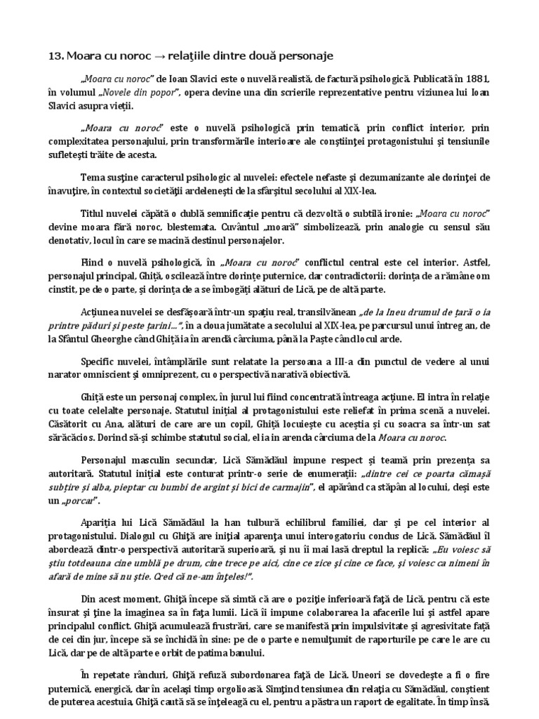 Moara cu noroc relaţia dintre două personaje cuplul ghiţă ana nuvela moara cu noroc de ioan slavici este o nuvelă psihologică prin tematică prin conflict interior prin modalităţile de caracterizare a personajului şi de investigare psihologică. Moara cu norocîn literatura română nuvela a fost abordată începând cu secolul xix în special în perioada marilor clasici unele dintre aceste creaţii literare fiind adevărate capodopere. Moara cu noroc de ioan slavici apărută în anul 1881 este o operă realist psihologică ce are un caracter profund moralizator prin care autorul critică lipsa de valori spirituale ale omenirii. Moara cu noroc ioan slavici moara cu noroc ažn literatura romana nuvela a fost abordata incepand cu secolul xix in special in perioada marilor clasici unele dintre aceste creatii literare fiind adevarate capodopere.