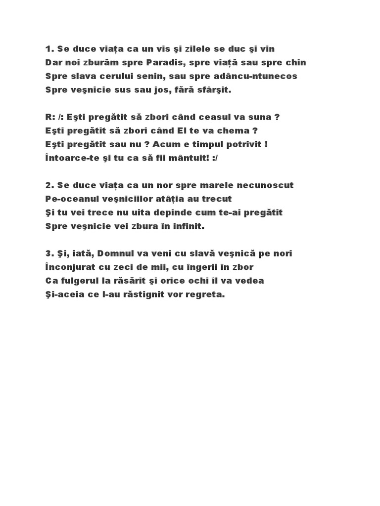Se duce viata ca un vis lyrics. Se duce viata ca un vis pe marele necunoscut pe oceanul vesniciilor atatia au trecut. şi iată domnul va veni cu slava veşnică pe nori înconjurat cu zeci de mii cu îngerii în cor. întoarce te şi tu ca să fii mântuit. Se duce viaţa ca un vis şi zilele se duc şi vin dar noi zburăm spre paradis spre viaţă sau spre chin spre slava cerului senin sau spre adâncu ntunecos spre veşnicie sus sau jos fără sfârşit.