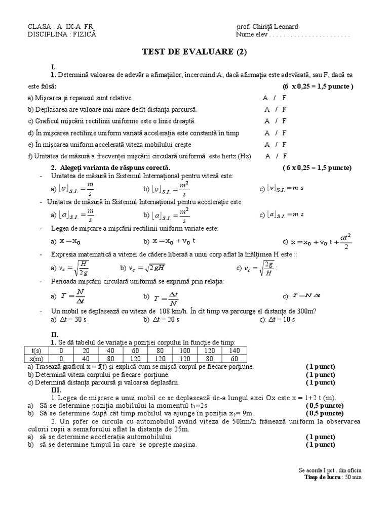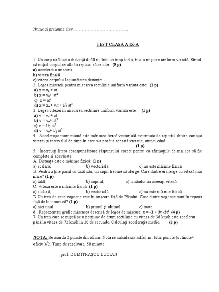 Test Fizica Clasa 9