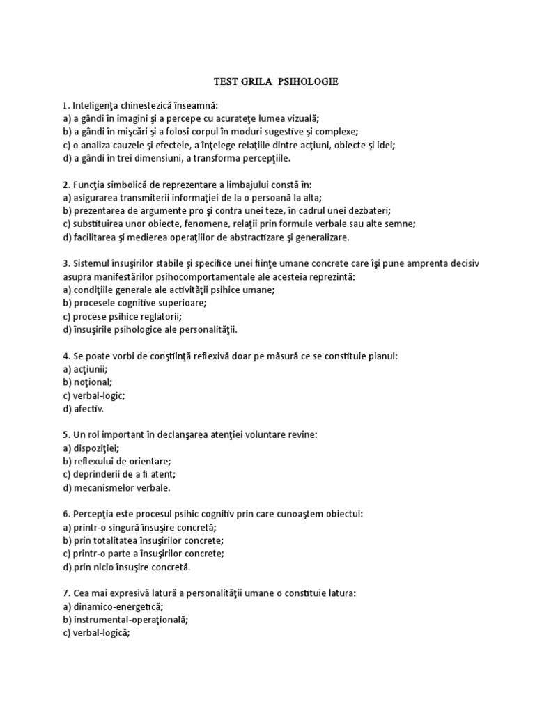 Teste grila psihologie admitere facultate. Toate informaţiile necesare răspunsurilor corecte sunt conţinute în text. Variante si grila evaluarea nationala bacalaureat admitere facultate. Teste grila admitere facultate. Manual pentru clasa a x a editura polirom.