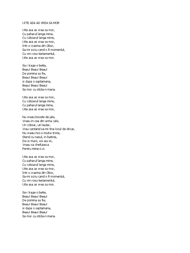 Uite asa as vrea sa mor cu cobzarul langa mine cu paharul langa mine. Intr o crasma din obor sa mi scriu cind o fi momentu cu vin rosu testamentu uite asa as vrea sa mor. Să i tragem o beţie beau. Sa i trage o betie beau beau beau de pomina sa fie beau beau beau si dupa o saptamana beau beau beau sa mor cu sticla n mana.